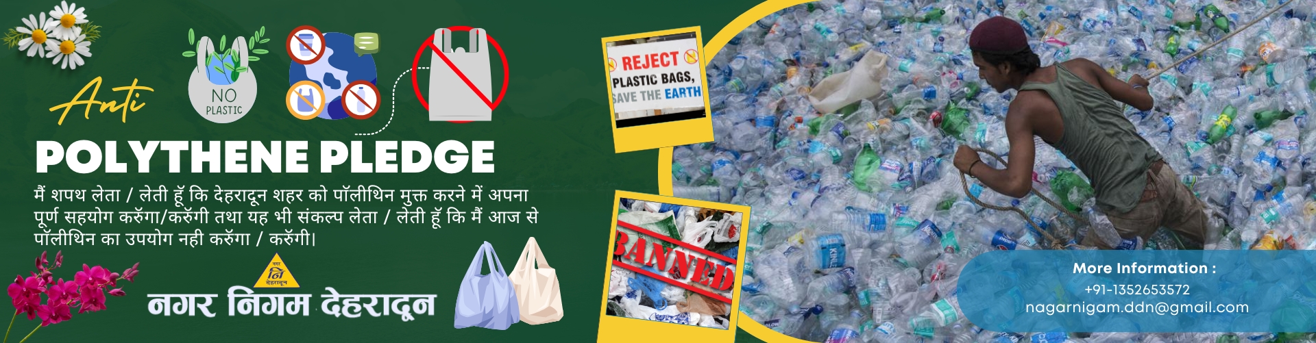 मैं शपथ लेता / लेती हूॅ कि देहरादून शहर को पाॅलीथिन मुक्त करने में अपना पूर्ण सहयोग करुॅगा/करुॅगी तथा यह भी संकल्प लेता / लेती हूॅ कि मैं आज से पाॅलीथिन का उपयोग नही करुॅगा / करुॅगी।